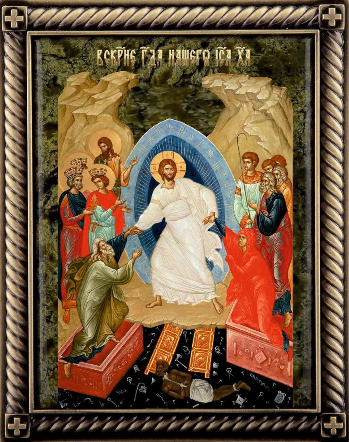 Композиция «Сошествие Христа во ад» заменяет собой образ Воскресения и передает основной смысл праздника – избавление людей от уз вечной смерти. В византийской традиции она имеет название «Воскресение» (Ανάστασις).