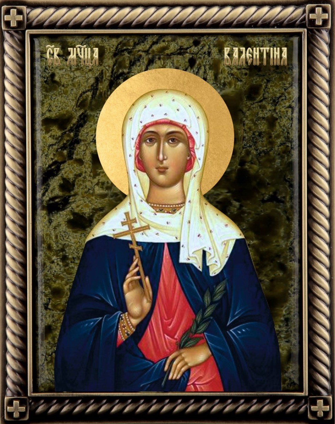 Валентина родом из Кесарии был христианкой. Языческий правитель Палестины, обвинил ее в непочитании богов и приказал привести в языческий храм, для принесения жертвы. Святая смело бросила камень в жертвенник и сама обратилась к пылавшему на нем огню. За это ее нещадно мучили и приговорили к усечению мечом.