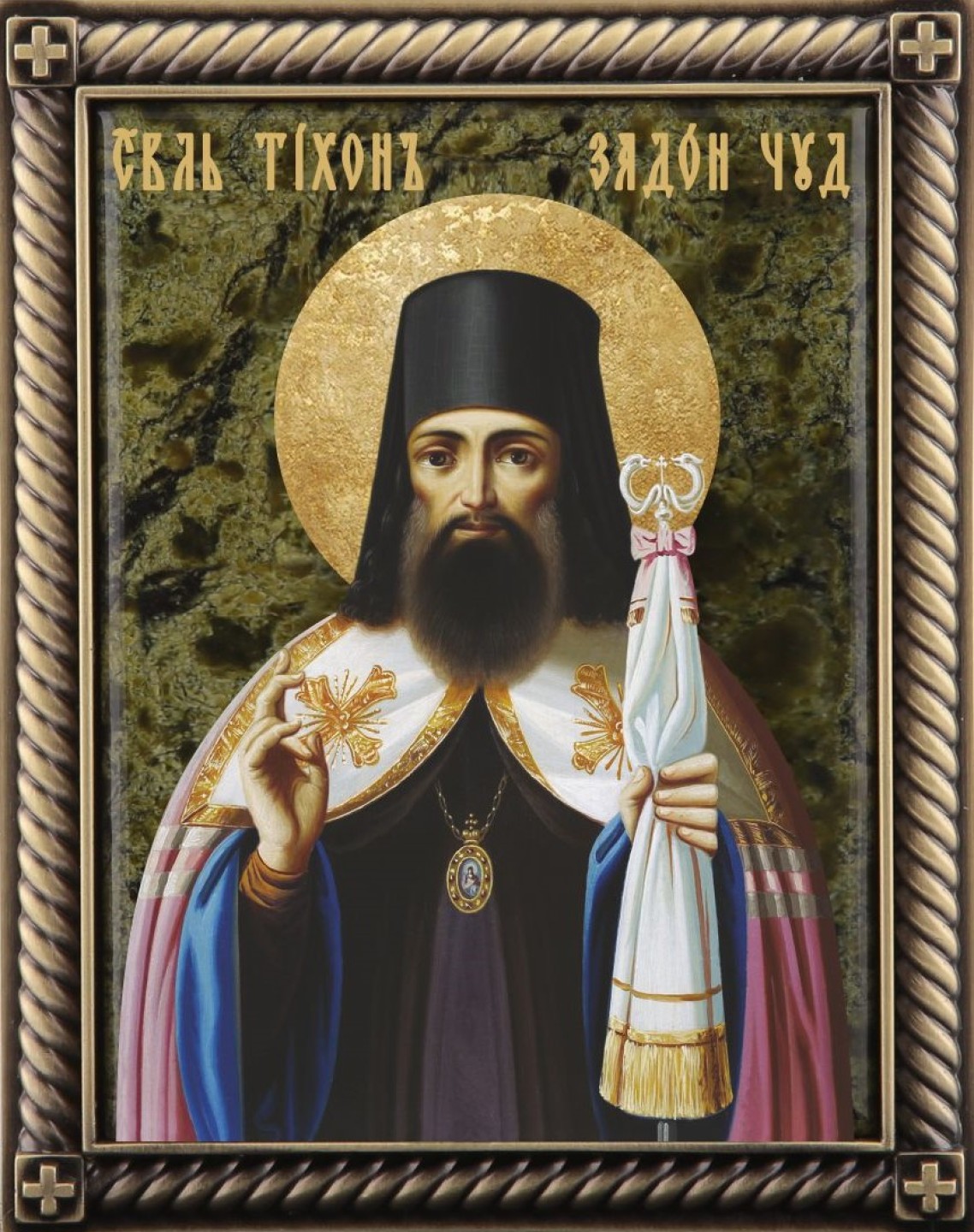 Святой Тихон жил в XVIII веке, в Новгородской губернии. Учась в семинарии, был усерден, отличался умом и кротостью. Став священнослужителем начал быстро подниматься по церковной иерархии. Уже в 34 года Тихон стал главой семинарии, через год – архимандритом, а в 37 лет - епископом. Однако вскоре подал в отставку, и поселился в Богородицком монастыре. Святитель жил очень скромно, спал на соломе, ел, что дадут, во время служб тихо стоял в алтаре и молился. Преподобный уделял много времени благотворительности и писанию духовных сочинений, широко известен сборник его коротких поучений под названием «Сокровище духовное, от мира собираемое». Святой Тихон имел дар прозорливости, предсказывая некоторые исторические события и мог читать мысли людей. За свою праведную жизнь и сострадание к людям, заслужил всенародную любовь и почитание.