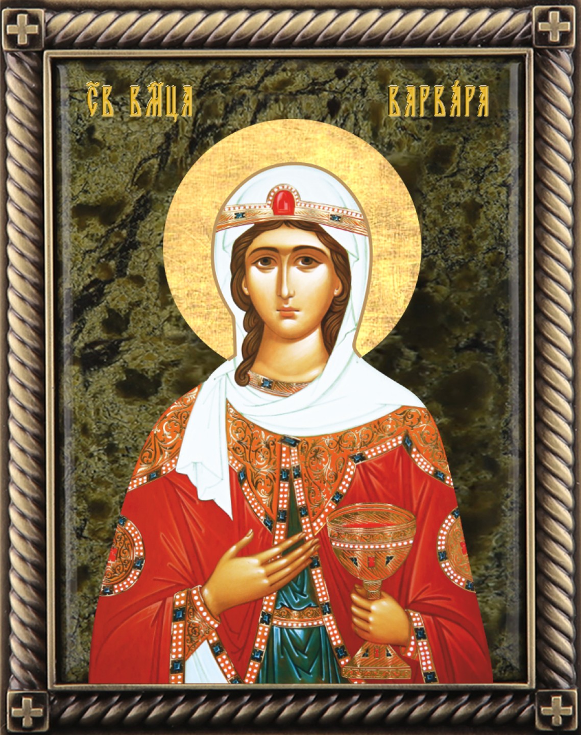 Святая Варвара жила в 3 веке в Никомидии. Девушка была красива и умна. Рано потеряла мать и осталась на попечении своего отца язычника. Он заточил ее в башню, что бы оградить от соблазнов мира. В заточении девушка много размышляла о том, откуда вся эта красота вокруг. Кто все это создал? Ей рассказывали о языческих богах, но она не могла поверить в это. Наконец отец вывел ее в мир, надеясь, что она встретит знатного жениха, но девушка напротив, нашла христианского наставника и тайно приняла крещение. Узнав об этом он отдал ее на растерзание императору.