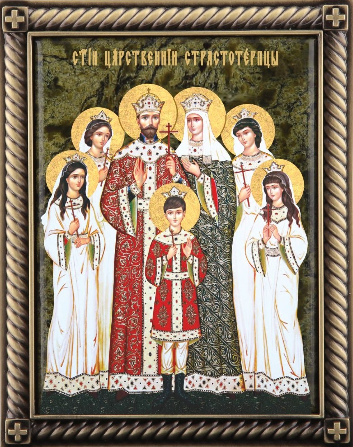 На иконе «Святые царственные мученики» изображена фамилия последнего государя Российского – венценосного поборника православия Николая II: царица Александра Фёдоровна, царевич Алексей Николаевич, великие княжны Ольга, Мария, Татьяна и Анастасия.