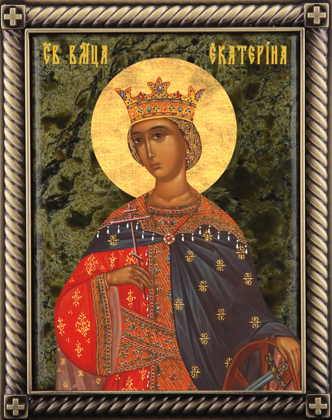 Святая великомученица Екатерина Александрийская жила в III веке. Дочь знатных родителей, она отличалась редкой красотой и умом. Однажды во сне ей явился Господь с Пречистой Девой Марией и передал ей перстень в знак обручения с ней, который всегда оставался на ее руке. Проснувшись и увидев перстень, она исполнилась величайшей радостью и верой в Господа Бога. Екатерина пришла к императору Максимину, который был идолопоклонником и доказала истину христианской веры. После мучительных истязаний - скончалась